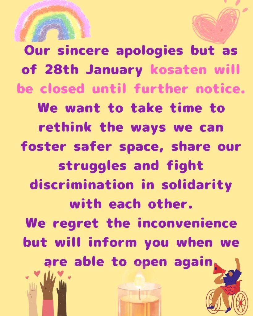 Important:Kosaten is now more of an accessible space – we have moved to 1st floor and also have a wheelchair accessible toilet and space for diaper changing. There is still more we need to do to make our space open to more people, so if you have any suggestions please let us know!